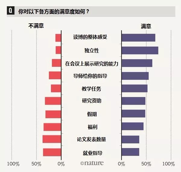 调查还发现,和博士导师意气相投的学生更容易成功,这一点或许发挥着至关重要的作用。导师优秀的指导是提升学生满意度的主要因素。大多数参与调查的人对自己的导师感到满意,但仍有四分之一的人表示,如果可能的话,他们希望换导师。
