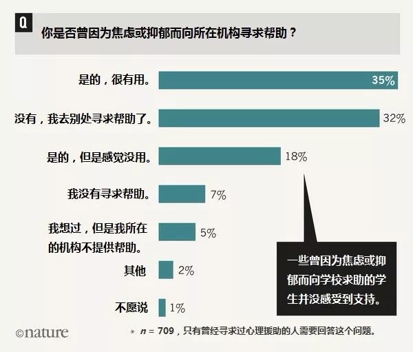 《自然》的调查还发现,焦虑的博士生们并不总是能方便地得到帮助。在那些曾寻求心理干预的人中,只有35%的人表示他们所在的机构能提供有用的资源。接近20%的人表示,他们所在的机构并不能为他们提供帮助。Levecque认为,“在寻求心理援助时他们会遇到许多文化和经济障碍。”
