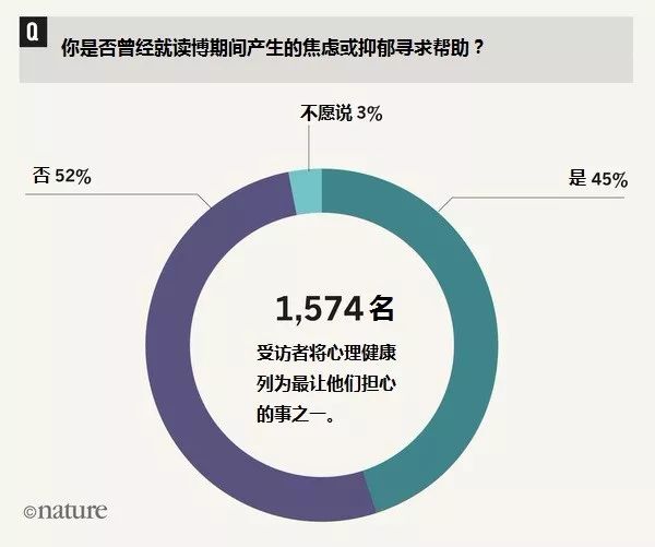 12%的受访者曾经由于读博过程中出现的焦虑和抑郁情绪寻求帮助,Levecque认为这表明了研究生生活中出现的压力的严重性,“你要承担许多责任,但是你对很多事却无能为力。”由于这12%的受访者仅仅包括那些曾经寻求过心理干预的人,因此可以肯定,在所有受访者中,焦虑和抑郁的水平应当更高。