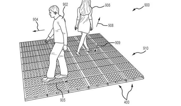 专利描述了三种在有限区域内创建无限行走感觉的解决方案:第一种是利用振动技术来为用户双脚提供或多或少的摩擦感。另一种方法采用了一系列的旋转圆盘,通过这种方式来影响用户的方向。最后一种解决方案则包含磁铁,分别设置在用户的鞋子和地板下面的“移动履带”。