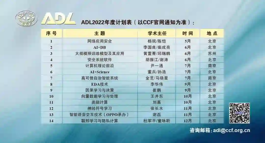 ADL(CCF Advanced Disciplines Lecture)是面向青年学者和产业界技术人士的学科前沿讲习班,创建于2009年,由国内外相关领域的资深专家授课,深入系统地讲解计算领域的理论、技术和发展趋势,每年10期左右,每期3天。咨询邮箱:adl@ccf.org.cn