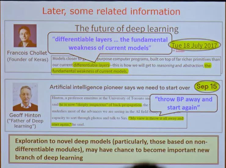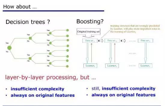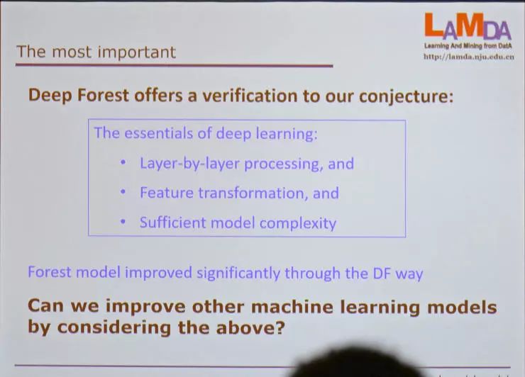 那么,有没有可能做出合适的深度模型,在这些任务上得到更好的性能呢? 我们从学术的观点来总结一下,今天我们谈到的深度模型基本上都是深度神经网络。如果用术语来说的话,它是多层、可参数化的、可微分的非线性模块所组成的模型,而这个模型可以用 BP 算法来训练。 那么这里面有两个问题。第一,我们现实世界遇到的各种各样的问题的性质,并不是绝对都是可微的,或者用可微的模型能够做最佳建模的。第二,过去几十年里面,我们的机器学习界做了很多模型出来,这些都可以作为我们构建一个系统的基石,而中间有相当一部分模块是不可微的。 现在我们遇到了这样一个大挑战,可不可以用不可微的模块构建深度模型?这不光是学术上的,也是技术上的一个挑战,就是我们能不能用不可微的模块来构建深度模型? 这个问题一旦得到了回答,我们同时就可以得到很多其他问题的答案。比如说深度模型是不是就是深度神经网络?我们能不能用不可微的模型把它做深,这个时候我们不能用 BP 算法来训练,那么同时我们能不能让深度模型在更多的任务上获胜?