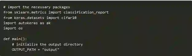 我们在第7行定义脚本的主要功能,由于Auto-Keras和TensorFlow处理线程的方式,我们需要将代码包装在main函数中。有关更多详细信息,请参阅此GitHub问题线程。