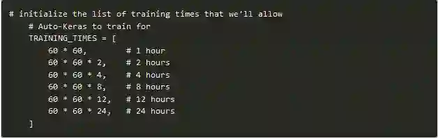 上述代码是限定了一组训练-TIMES,包括[1,2,4,8,12,24]小时。我们将使用Auto-Keras来探索更长的训练时间对精确度的影响。