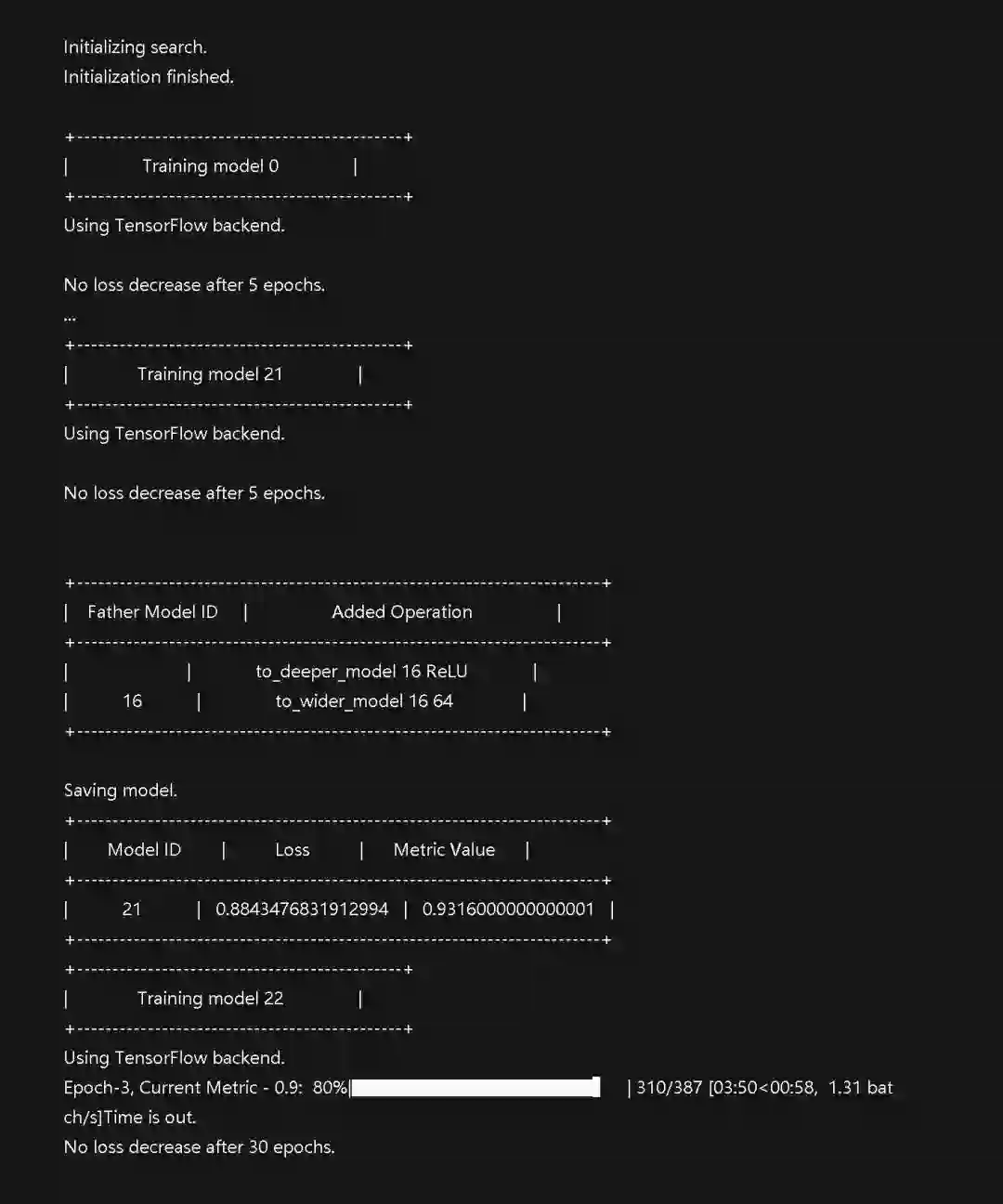 ·初始化我们的模型(AK.ImageClassifier),并让训练开始。请注意,我们并没有实例化一个特定对象的CNN类,我们也没有调整超参数。因为Auto-Keras会为我们处理所有这些。