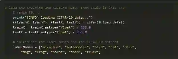 我们的CIFAR-10数据被加载并存储在第25行的训练/测试分组中。随后,我们将这个数据缩放到[0,1]的范围。接着我们会初始化我们的类labelNames,这10个类包含在CIFAR-10中。请注意,标签在这里很重要。