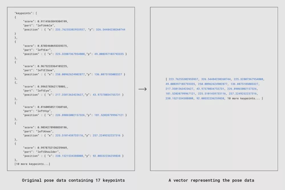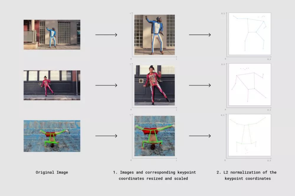 最终,团队选择了包含多种动作,不同体型、肤色、文化的一组视频,将其切分为8万张静止图像。使用PoseNet处理这些图像,并储存相应的位姿数据。