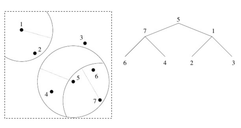 我们在数据点中选取一点(可以随机选取)作为根节点(上图中为5)。我们绕着5画一个圈,将空间分割成圈内和圈外两部分。接着我们在圈内、圈外各选一点作为制高点(上图中为7和1)。接着,绕着每个制高点各画一个圈,同样在圈内、圈外各选一点……以此类推。这里的关键在于,如果我们从点5开始,然后发现7比1更接近目标,那么我们就可以跳过1的所有子节点。