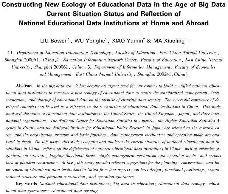 关键词:国家级教育数据机构;教育大数据;教育数据生态;教育数据治理;教育数据开放