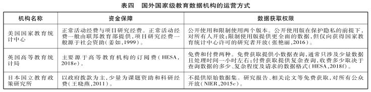 国外教育数据机构的运营方式(见表四)显示,这些机构有稳定的资金来源,多以国家拨款为主,也通过项目研究和社会服务自筹资金,及接收少量的社会捐助。多样的资金来源保障了机构的稳定运作。