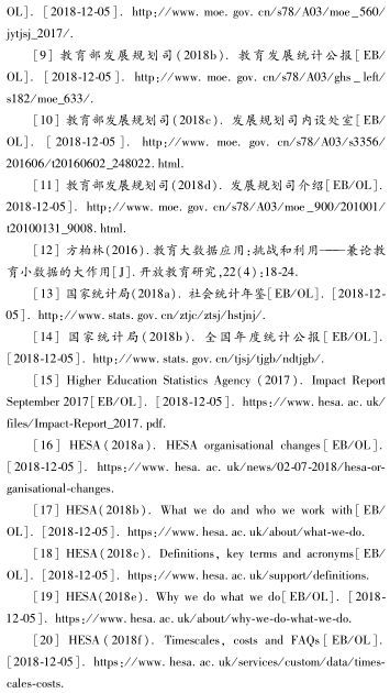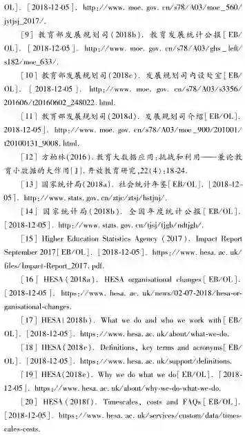 英国高等教育统计局成立于1993年,由政府部门、高等教育资助委员会和各高等教育机构联合成立,主要负责高等教育数据的收集、分析、处理和发布,旨在为地方、国家、国际组织、高等教育机构、学术和商业研究人员、学生、企业、媒体、雇主及慈善机构提供可靠的教育数据和信息。经过二十多年的发展,该局在确保英国高等教育数据的精确性和连贯性方面起到了关键作用(崔艳丽,2014)。截至2017年9月,英国高等教育统计局已与261所高等教育机构建立了合作,处理了1.18亿条记录,获得280多万学生的完整数据(HESA,2017),连续发布了23版《英国高等教育统计》(HESA,2017)。