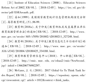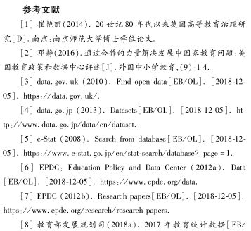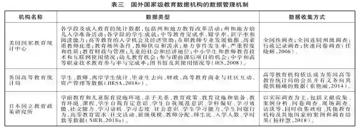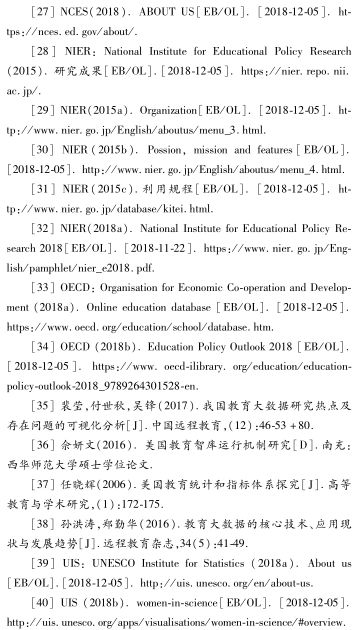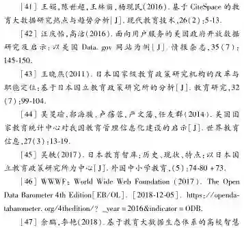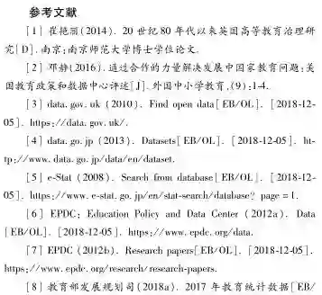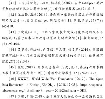 国外发达国家的成功经验对我国教育数据机构的建设意义重大。美、英等国制定了国家层面的教育数据开放战略,建立了统一的国家级教育数据开放平台(杨现民等,2018)。日本国立教育政策研究所在《全球智库报告2017》教育政策类智库中位列第一(McGann,2018),可见其在发挥教育数据促进教育发展上成绩显著。