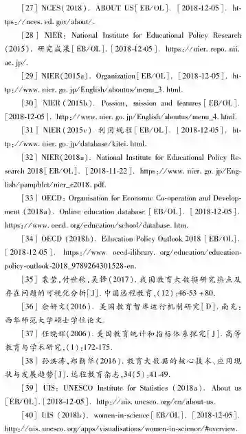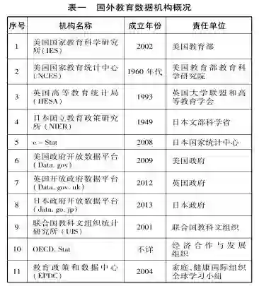 发达国家较早认识到教育数据的价值,较先建立起各类教育数据机构,如美国国家教育统计中心、日本国立教育政策研究所等。历经多年的发展和完善,这些教育数据中心对促进本国乃至国际教育发展产生了较大影响。此外,联合国教科文组织、经合组织等在促进教育数据的国际共享与开放方面也起到了重要作用。