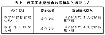 数据管理机制方面,国外教育数据机构收集与开放的教育数据类型更详实与深入,包括学习效能社交能力、学习动机、高等教育需求、学习态度等深层教育统计数据。我国教育数据机构的主要工作仍停留在基础性教育数据统计,很少收集并挖掘深层次教育数据的价值,难以真正发挥数据的功效(祝智庭等,2017a)。运营方式方面,国外教育数据机构有多样的资金保障和灵活的数据获取权限。我国教育数据机构仅靠政府拨款作为资金保障,数据获取权限设置单一,仅对外开放基础性教育统计数据,无法支持定制化的数据获取需求,一定程度上限制了教育数据的开放共享与机构的良性运转。