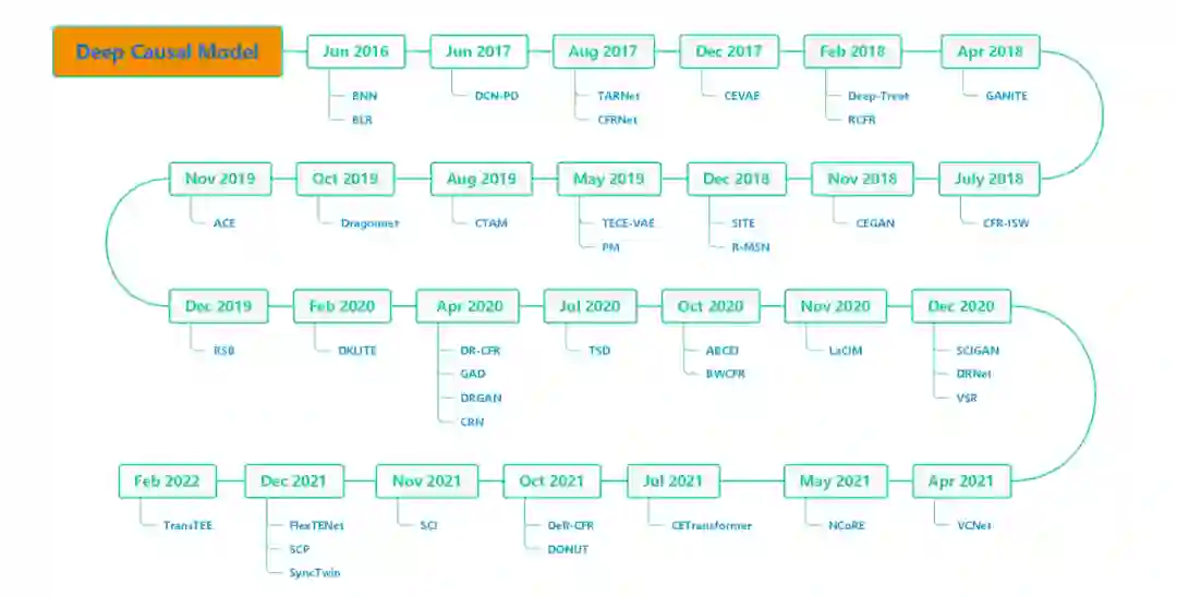 近年来,深入因果模型的研究越来越受欢迎。随着深度学习的发展,各种深度因果模型在估计因果效应方面变得更加准确和有效。根据图1,我们列出了2016年6月至2022年2月期间约40个经典的深度因果模型,包括它们的详细名称和提出时间。深度因果模型从2016年开始开发。Johansson等首次发表了反事实推理的学习表示[41],提出了算法框架BNN和BLR[41],将深度学习与因果效果估计问题相结合,将因果推理问题转化为领域适应问题。从那时起,许多模型被提出,包括DCN-PD[110], TARNet和CFRNet[43]。在这方面,需要注意的是,Louizos等人在2017年12月提出的基于深度网络经典结构参数自编码器VAE的CEVAE[54]模型,主要关注混杂因素及其对因果效应估计的影响。