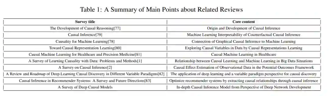 近年来,人们对因果推理的各种观点进行了讨论[77,1,78,79,80,81,82,83,2]。表1列出了相关综述的标题和要点。文献[77]深入分析了因果推理的起源和变量发展,以及因果学习对因果推理发展的影响。此外,调查[1]对传统和前沿的因果学习方法进行了概述,并对机器学习和因果学习进行了比较。许多学者讨论了如何解释机器学习。随后,为了创建可解释的人工智能算法,survey[79]结合了因果推理和机器学习。作为一种新颖的视角,因果表征学习正在蓬勃发展,综述[80]利用它从低级观察中发现高水平的因果变量,加强了机器学习和因果推理之间的联系。由于近年来因果机器学习的流行,综述[78]对图因果推理与机器学习的相关性进行了详细的讨论。此外,在调查[81]中,作者考察了机器学习的最新进展如何应用于因果推理,并对因果机器学习如何有助于医学科学的进步提供了全面的解释。正如综述[82]所认为的,基于深度学习可以改进和整理因果发现方法,可以探索可变范式来帮助思考和探索因果发现方法。推荐系统中的因果推理是调查的重点[83],它解释了如何使用因果推理来提取因果关系,以增强推荐系统。长期以来,统计的潜在结果框架一直是连接因果推理和深度学习的桥梁,作为起点,综述[2]检查并比较了满足这些假设的不同类别的传统统计算法和机器学习算法。由于深度学习算法的快速发展,现有文献在考察泛化时没有考虑深度因果模型。因此,我们从深度网络的角度,从时间和分类两方面总结了深度因果模型。本综述对近年来的深度因果模型进行了全面的回顾和分析。它有三个核心贡献: 1)我们在多次treatments 和连续剂量treatments 的情况下纳入了相关指标。2)我们从方法分类和时间发展的角度对深层因果模型进行了全面的概述。3)我们在相关数据集和源代码的分析和分类方面提供详细和全面的支持。