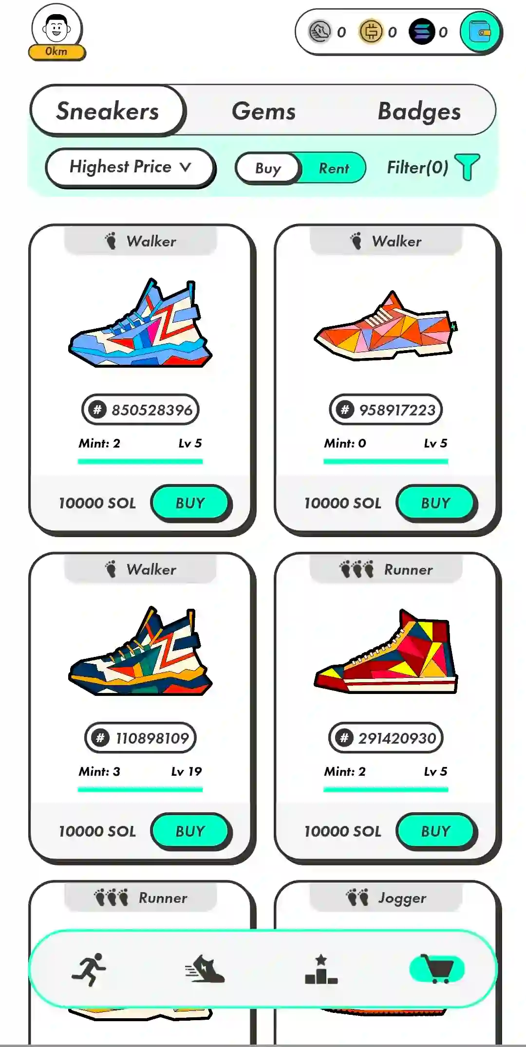 运动鞋NFT分为Walker走路鞋、Jogger慢跑鞋、Runner跑步鞋、Trainer全能鞋,对应着运动时不同的配速,比如Walker的时速限制是1-6km/h。
