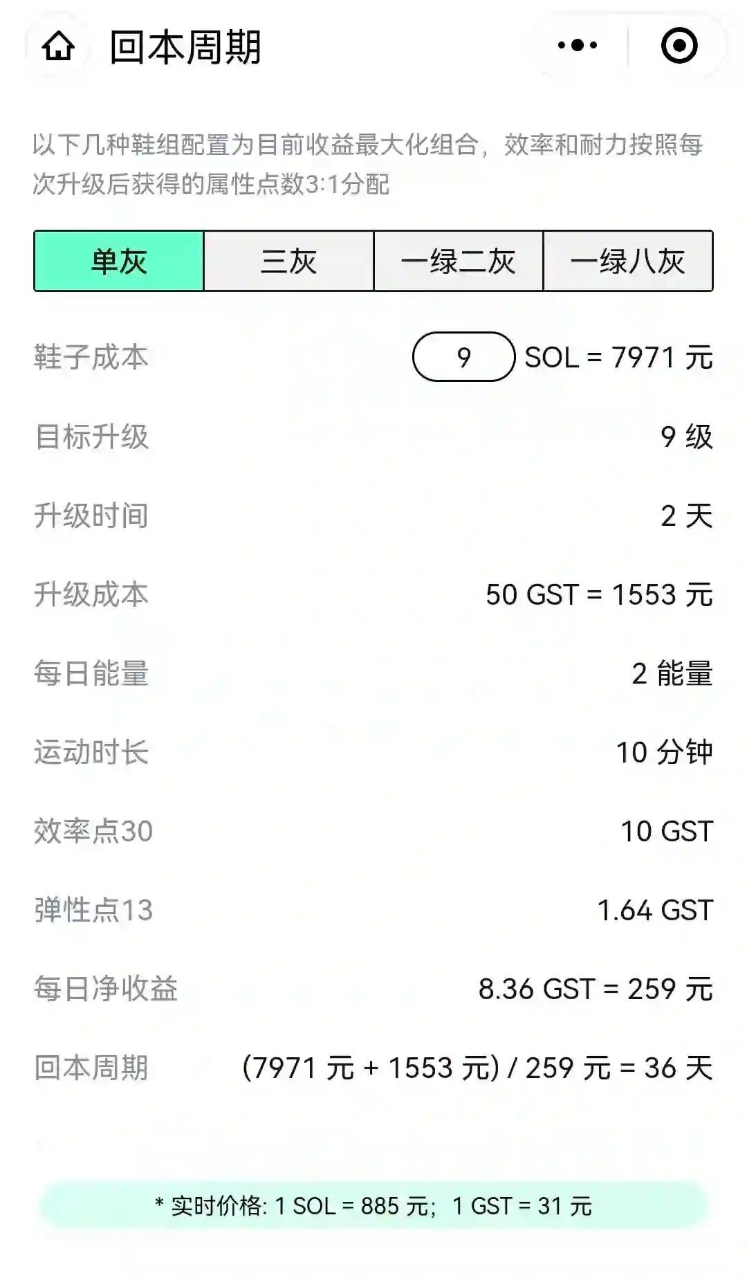在一些STEPN社群中,有人专门制作了计算回本周期的小程序助手,单灰、三灰、一绿二灰、一绿八灰被视为是新人入场能收益最大化的组合方式。