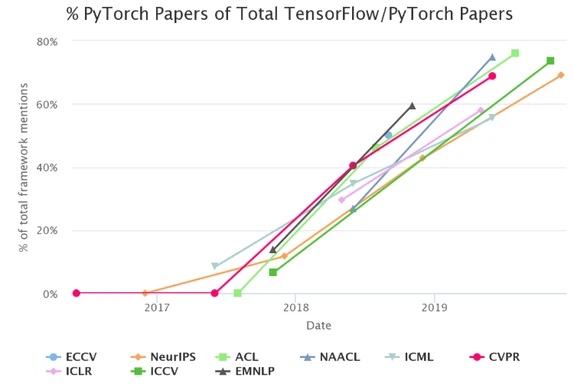 自2015年以来,TensorFlow一直占据上风,但是PyTorch在发布后也逐渐升温,在开发人员社区中快速普及。
