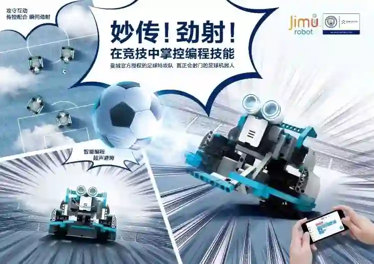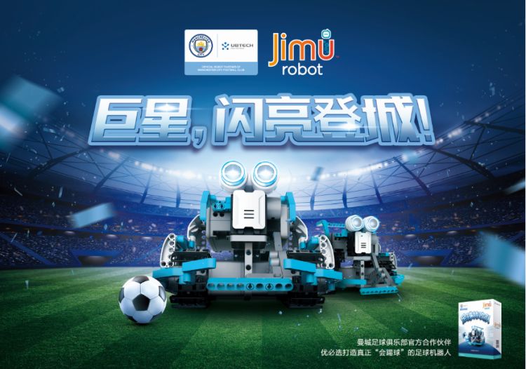 但我们依然有解决方案。视频中,曼城球员和小朋友们组装、操作的,便是由优必选Jimu Robot结合曼城元素推出的“足球特攻队ScoreBot”,它以积木零配件拼接,搭载了模拟人类关节的数字舵机、协助机器人定位的超声传感器,并搭配内置的编码校正系统,能够完成精准的踢球和射门动作。