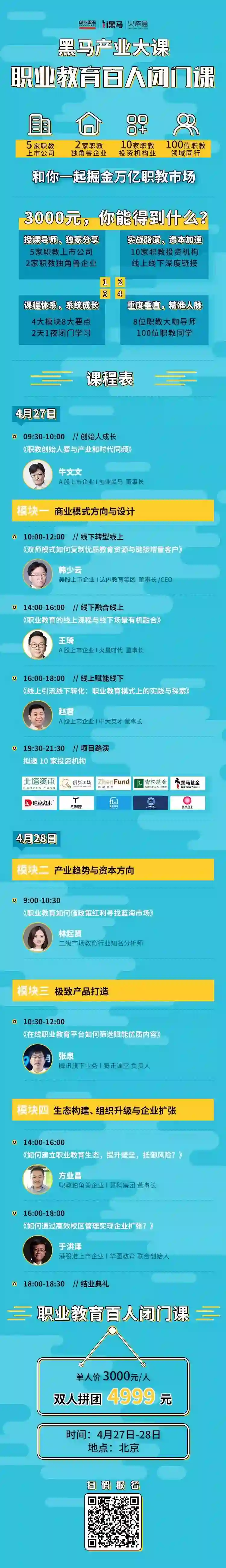 面对时代的大潮,创业黑马联合职业教育行业大咖,定于4月27日-28日举办“职业教育·百人闭门课”,一起掘金万亿职教市场,一起触摸教育产业未来!