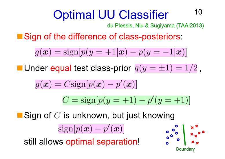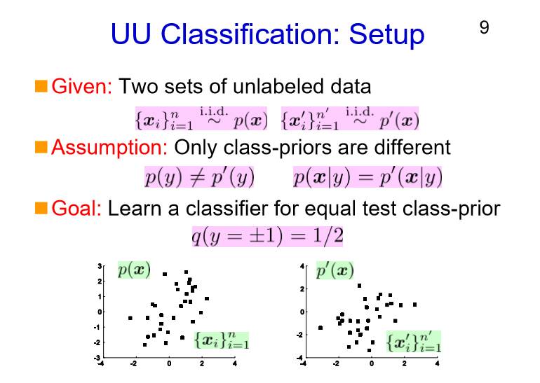 那么我们是怎样对无标注的数据进行分类的呢?假设我们有两个未标注的数据集,它们唯一的不同在于类先验(class-priors,即所属的类别)的不同。它们的函数分布如图中的左右下角,数量上各占50%左右,其实我们并不需要知道具体的比例。基于这种假设,我们需要训练一个分类器,而基于无标注数据的训练是极具挑战的。