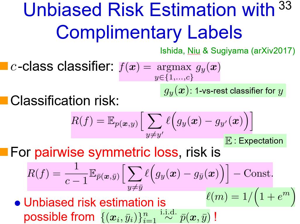 接下来可能就有点复杂了,假设我们做c类的分类,我们把R(f)和gy拿出来,gy就是单个class的分类风险,我们会对这个分类风险进行一个分析,今天我只举其中的一个风险的分析的公式。我们把两个分类进行对比,然后去算它的损失,我们会有这样的一个程度对称性的损失,就得出它的风险。