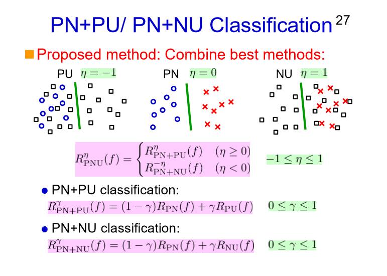 所以,我们的方法就是把它们结合起来,进行一个组合,根据我们自己假设性的数据进行切换,如果 是零,那就是变成一个PN分类学习,如果是 是负,那就加上PU学习,如果 变成正数我们就加上NU学习。后续继续选择,基本上在三者之间自由组合,添加一个不同PN、PU和NU的组合来实现自由分类。