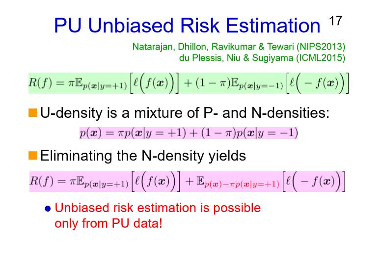 具体的公式转换如下图所示,它背后的理论是正负数据分类风险满足一定的边界条件,具体的细节在这里就不细说了。这是最优的方法,我们可以通过PU的学习,从PU的数据中得出PN的信息。