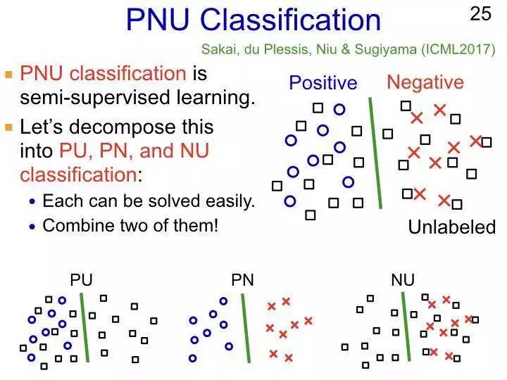 接下来我们介绍一下PNU (Positive, Negative, Unlabeled)分类,就是正类、负类和无标签数据的分类。PNU分类其实就是一个半监督的学习方法。