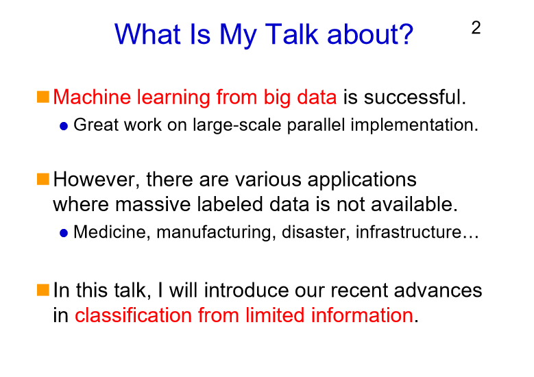 昨天漆远谈到了金融领域的机器学习,从大数据的角度来看,它是机器学习很重要的研究领域,并且目前还是非常的成功,我也一直对基于大数据来做机器学习这件事情非常感兴趣。然而,现在对于很多的应用领域而言是无法获取大规模的标注数据的,比如医药、制造业、防灾等领域。当数据量不够时,我们需要相应的机器学习方法来应对。