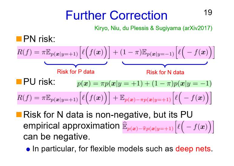 我们再来看一下之前的PN的风险函数公式,就是基于P数据和N数据的风险对U数据的分类风险进行估计。根据这个定义,N数据的风险是非负类的,但是它是PU的样本,在现实当中我们要对样本进行估计。所以说PU可能是会为负的,因为这个是会有一个负号,通常是应该是负号的,但有可能这个差会是负的,特别是对于可扩展性较高的模型来说,比如说像深度网络是会出现这个情况。