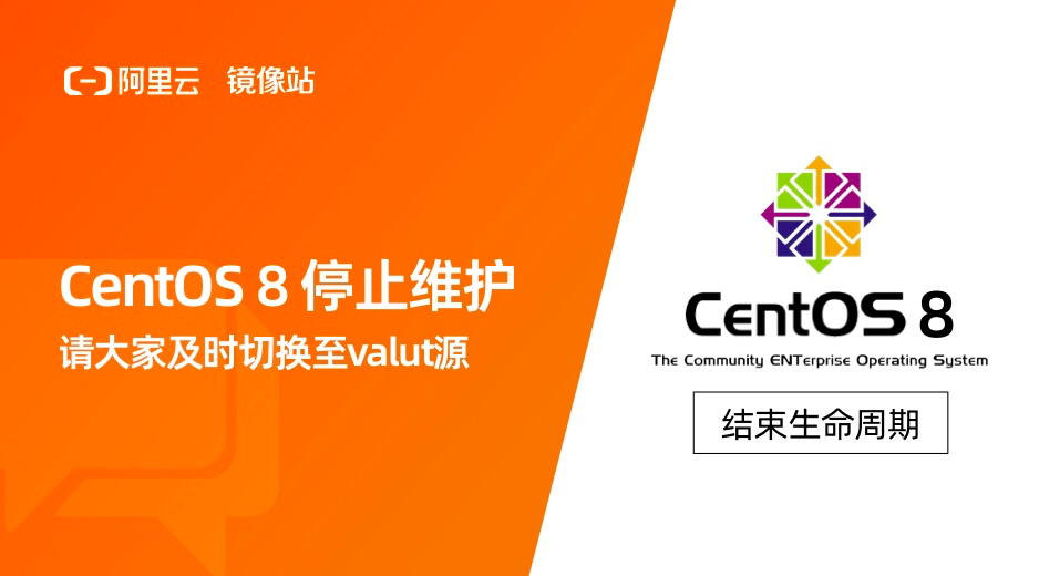 由于CentOS 8结束了生命周期,官方已经停止CentOS 8的维护,而阿里云镜像站的CentOS Linux公共镜像来源于CentOS官方,所以阿里云镜像站也移除了相应的CentOS 8镜像源。如果您是阿里云CentOS 8镜像源的用户,并且您的业务过渡期仍需要使用CentOS 8中的一些安装包,为了不影响您的使用,建议您切换至CentOS-Vault源, 具体配置请点击阅读原文。