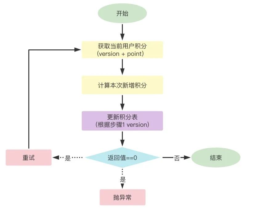 在数据库的表中需要包含一个数字类型的字段version,读取数据时把version字段读出来,更新数据时判断当前version是否等于读取出来的version,并对当前version+1;如果等于就更新成功,不等于表示数据已过期更新失败。例如以积分体系为例,存在多种场景增加积分,通过乐观锁来保证数据的正确性。