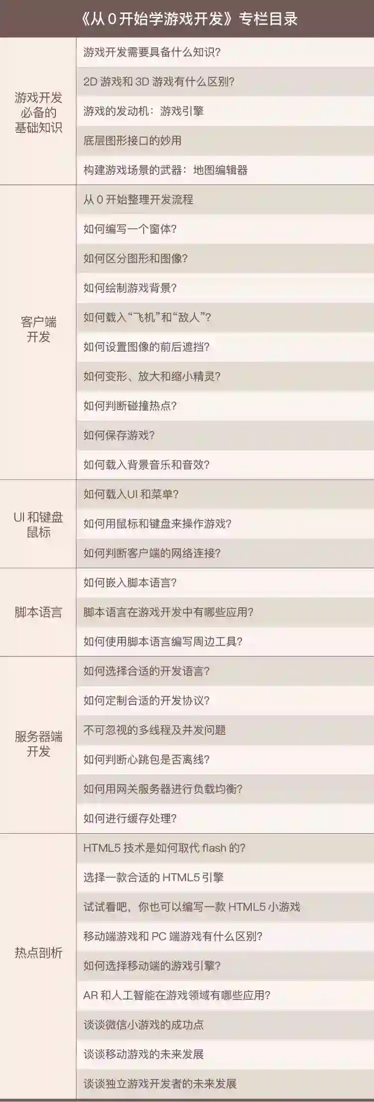 总之,我将结合自己二十余年的游戏领域实战经验,手把手带你梳理游戏开发流程,教你从零开始学习游戏开发,专栏目录见下图:
