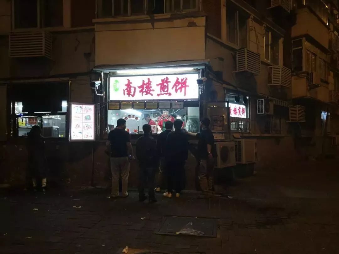 在各种关于天津煎饼果子的民间榜单上,没有一篇能漏掉南楼煎饼的身影。这家摊了十几年的煎饼铺子,有着特立独行的作息时间——晚上八点开门,早晨六点关门,在几乎没有夜生活的天津,南楼煎饼几乎用一己之力制造了一种天津人的深夜生活方式。每天晚上,它门前的长队都能一口气甩一个十几人的大拐弯。