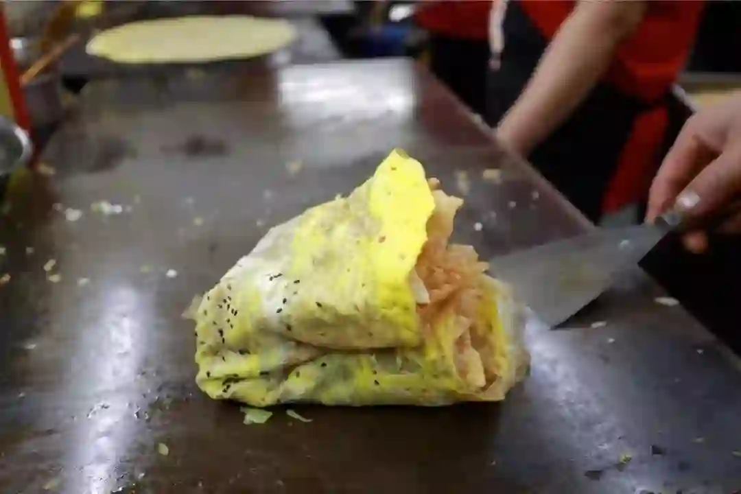 不是纯绿豆面儿磨的饼皮,那就是天津人心目中的邪教。此外,撒了香菜末子的,也是邪教。至于再添了番茄火腿沙拉汁、榨菜生菜土豆丝,那都不能叫煎饼果子了。对于勇敢为真爱代言的「十蛋」煎饼果子,师傅同样表达了不屑,「你干脆叫鸡蛋灌饼算了。」