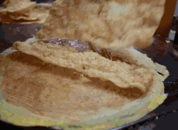 在埋汰所有外地煎饼果子的功夫上,郭德纲也可以认第一。「白面摊的,摊完叠起来那么大个,跟被窝似的,里边搁一果篦儿,火柴盒那么大,卷吧往里边,叠的跟棉裤似的。咬一口沾上牙堂子,拿火筷子往下捅。」