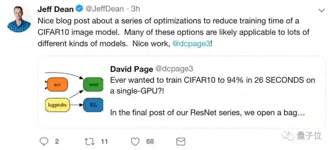 现在,谷歌AI掌门人Jeff Dean转发推荐了一个训练ResNet的奇技淫巧大礼包,跟着它一步一步实施,训练9层ResNet时,不仅不需要增加GPU的数量,甚至只需要1/8的GPU,就能让训练速度加快到原来的2.5倍,模型在CIFAR10上还能达到94%的准确率。