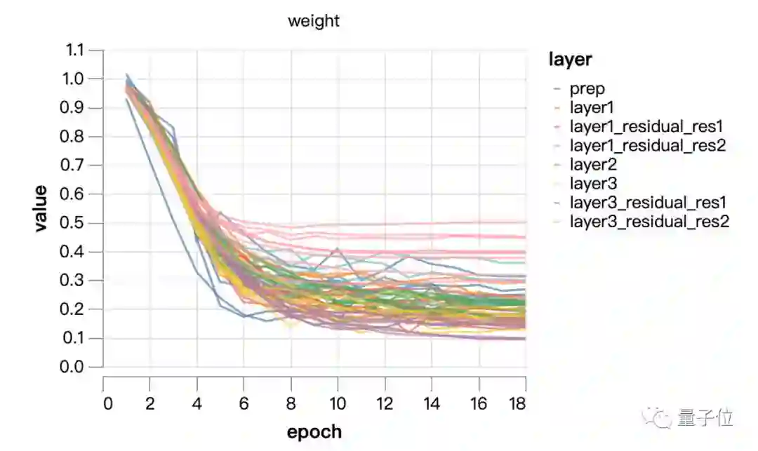 从上面这两张图中可以看出,规模并没有进行太多学习,主要是在权重衰减的控制下进化。尝试将规模固定在1/4的恒定值(训练中点的平均值)。最后一层的可学习比例稍大,这可以通过调整网络输出的比例来进行补偿。