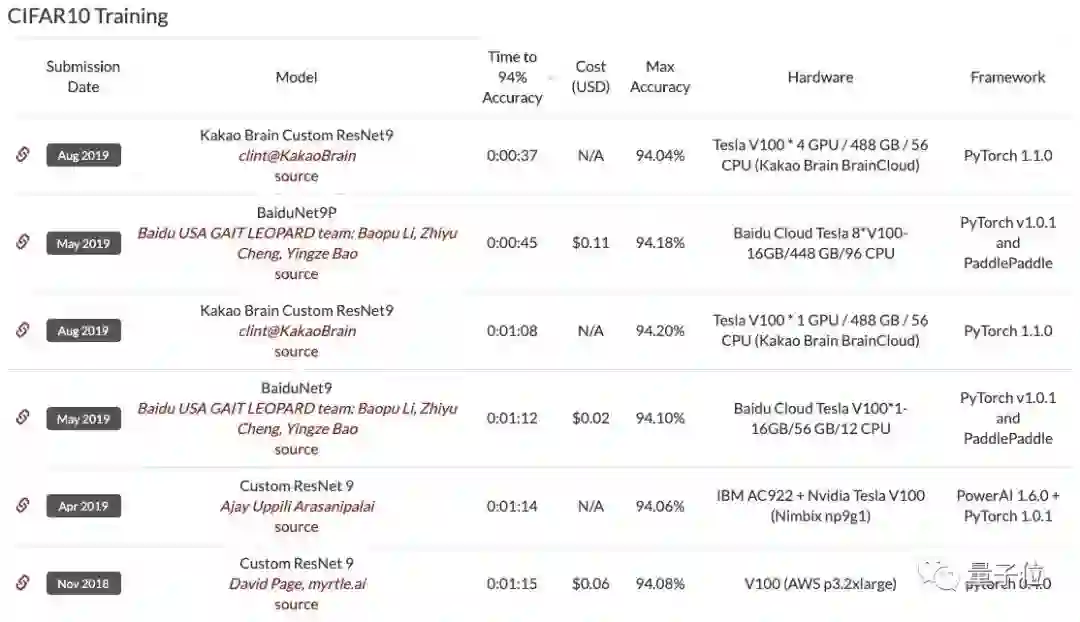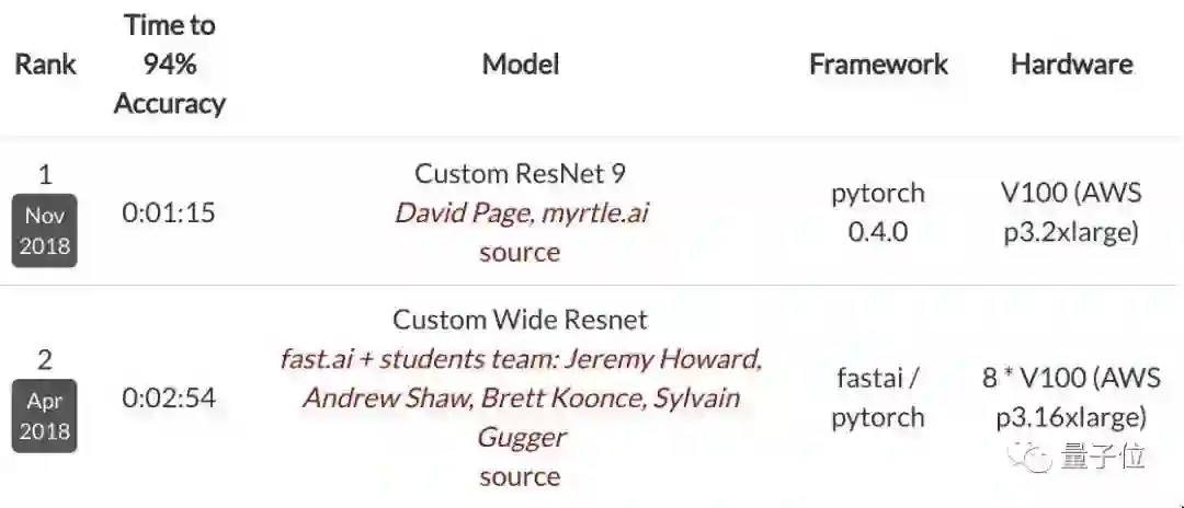 DAWNBench是斯坦福大学提出的基准,在这一排行榜中,准确度只要达到94%即可。
