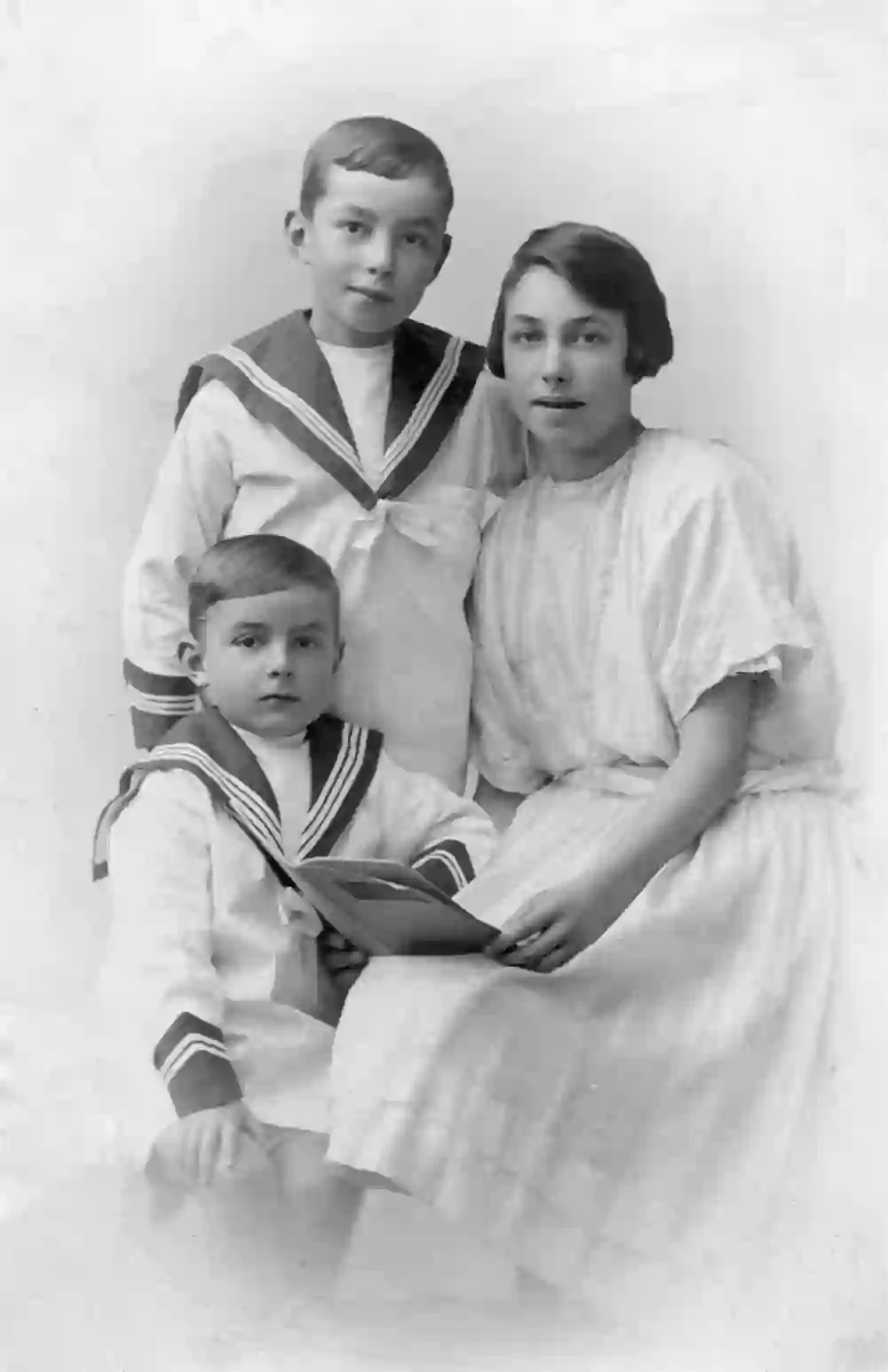 乔伊丝比我大十岁。她的母亲,我父亲的首任妻子,在一次流感爆发中去世。乔伊丝总是能够想出一些令人激动的游戏,而我们经常玩牛仔和印第安人游戏。乔伊丝需要在家中承担大量责任,但她对此没有怨言。除了照看两个弟弟,她还是我父亲在家里的主要帮手。我的父亲动手能力很强,而这是件幸事,毕竟我们钱财拮据。他能够搞定大多数人需要雇人来做的事情:修缮屋顶、修理煤气、更换墙纸,等等。但时不时地,他和乔伊丝会爆发争执,而乔伊丝会生气地跑下楼,甩下一句,“我再也不会帮他了”。过了大约十分钟,我的父亲会下楼道歉。然后他们会和好,并相安无事一段时间(图1.3)。
