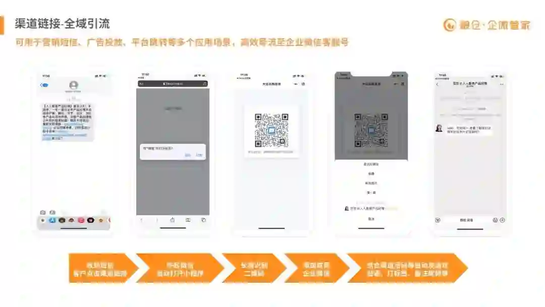 渠道链接是一个可以在外部渠道(非微信APP)一健呼起微信小程序的全域引流工具。客户在短信、百度APP等外部渠道,点击渠道链接,可一键呼起微信,直接引导添加企业微信号或引流至企业微信群聊,将外部渠道流量转为企业微信客户进行维护和转化。
