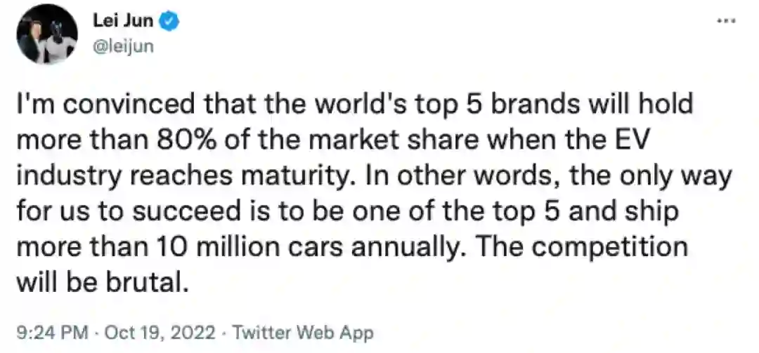 雷军在社交媒体表示:我相信,当电动汽车行业成熟时,世界前五大品牌将占据80%以上的市场份额。换言之,我们成功的唯一途径是成为前五名之一,每年出货量超过1000万辆,竞争将是残酷的。(界面新闻)