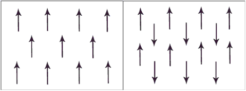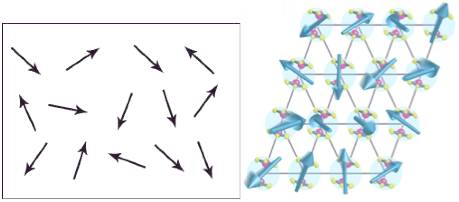 磁性材料的原子带有自旋,其可以用一个箭头来表示。低温下,这些自旋可以自发的排成有规则的阵列,从而得到一个自旋有序态。自旋都指同一方向的自旋有序态叫铁磁态。自旋上下交叉排列的叫反铁磁态。自旋有序态破坏了自旋旋转对称性,是一种对称破缺态。