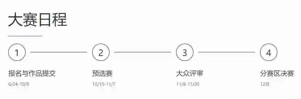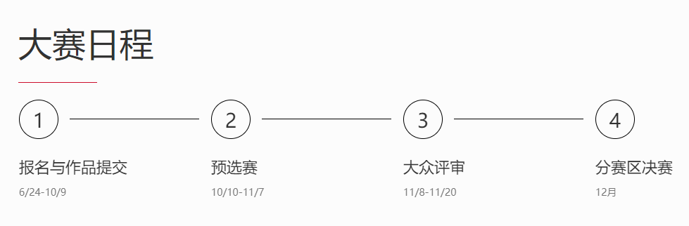 在经过组委会的层层审核和选拔后,大赛作品将于 10 月 10 日-11 月 7 日期间进行预选赛评选,11 月 8 日-11 月 20 日期间进行大众评审,并于 12 月进行决赛和颁奖。
