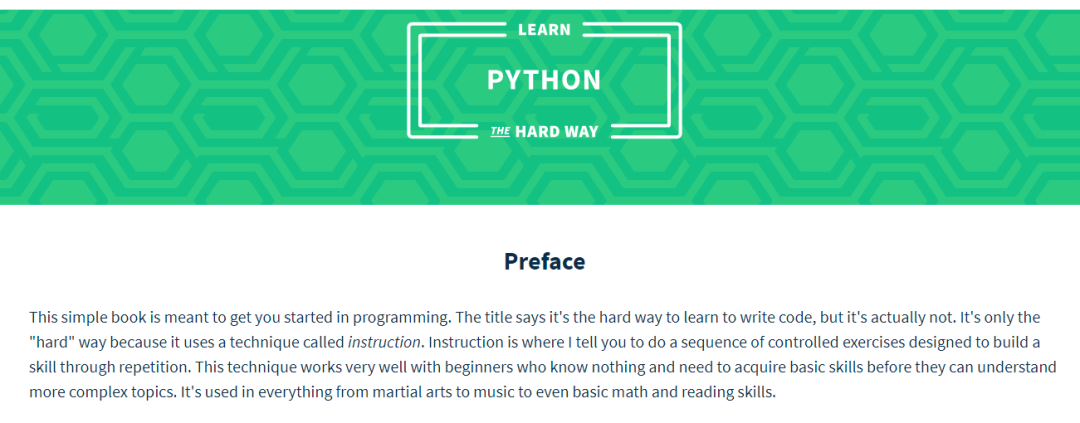 在 Python 的地界,有一本备受推崇的经典教材——Learn Python the Hard Way,有人将其亲切地翻译为《笨方法学 Python》。(在线阅览地址:https://learnpythonthehardway.org/python3/)