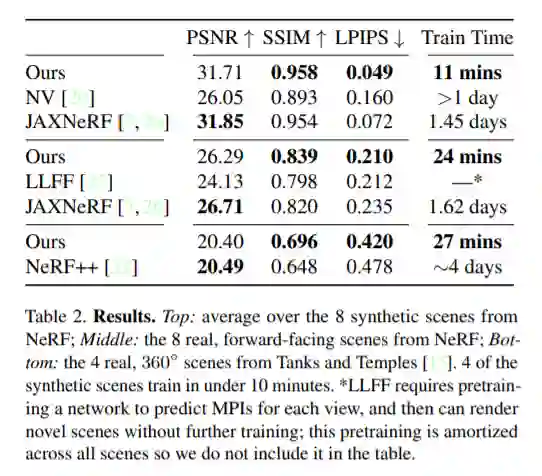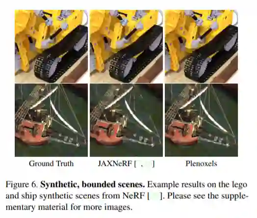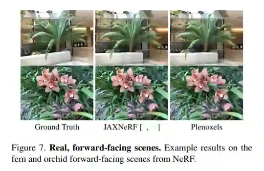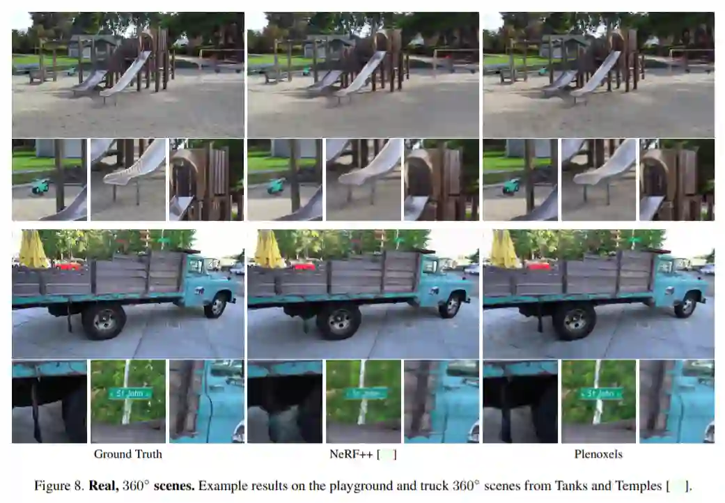 他们提供了一个定制的 CUDA 实现,利用模型的简单性来达到可观的加速。在有界场景中,Plenoxels 在单个 Titan RTX GPU 上的典型优化时间是 11 分钟,NeRF 大约是一天,前者实现了 100 多倍的加速;在无界场景中,Plenoxels 的优化时间大约为 27 分钟,NeRF++ 大约是四天,前者实现了 200 多倍的加速。虽然 Plenoxels 的实现没有针对快速渲染进行优化,但它能以 15 帧 / 秒的交互速率渲染新视点。如果想要更快的渲染速度,优化后的 Plenoxel 模型可以被转换为 PlenOctree(本文作者 Alex Yu 等在一篇 ICCV 2021 论文中提出的新方法:https://alexyu.net/plenoctrees/)。