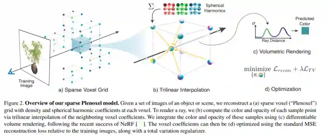 Plenoxel 是一个稀疏体素网格,其中每个被占用的体素角存储一个标量不透明度σ和每个颜色通道的球谐系数向量。作者将这种表征称为 Plenoxel。任意位置和观察方向上的不透明度和颜色是通过对存储在相邻体素上的值进行三线性插值并在适当的观察方向上评估球谐系数来确定的。给定一组校准过的图像,直接使用 training ray 上的渲染损失来优化模型。模型的架构如下图 2 所示。