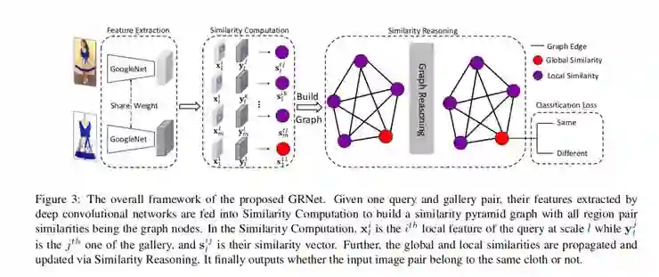 为了解决此问题,作者提出了一种基于相似金字塔的新的图论网络(GRNet),该算法通过使用多个比例的全局和局部表示来学习查询和图库之间的相似性。相似度金字塔由相似度图(Graph of similarity)表示,其中节点表示不同比例的服装组件之间的相似度,并且最终匹配分数是通过沿边缘传递的消息获得的。